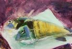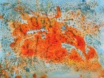 2017Afdruk van plasticfolie in natte oranje acrylverf wat een kreeftvorm deed ontstaan; de achtergrond is ingekleurd