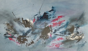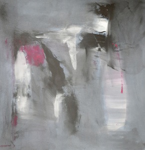 2023Abstracte compositie in grijze tinten met een kleuraccentop blauwe ondergrond