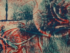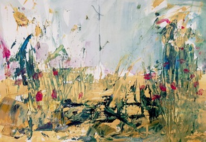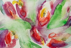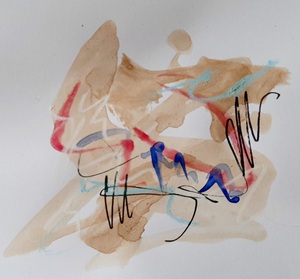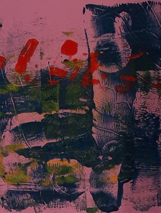 2023Een spontane compositie voor een kunstkaart, met verfspatel in primaire kleuren.